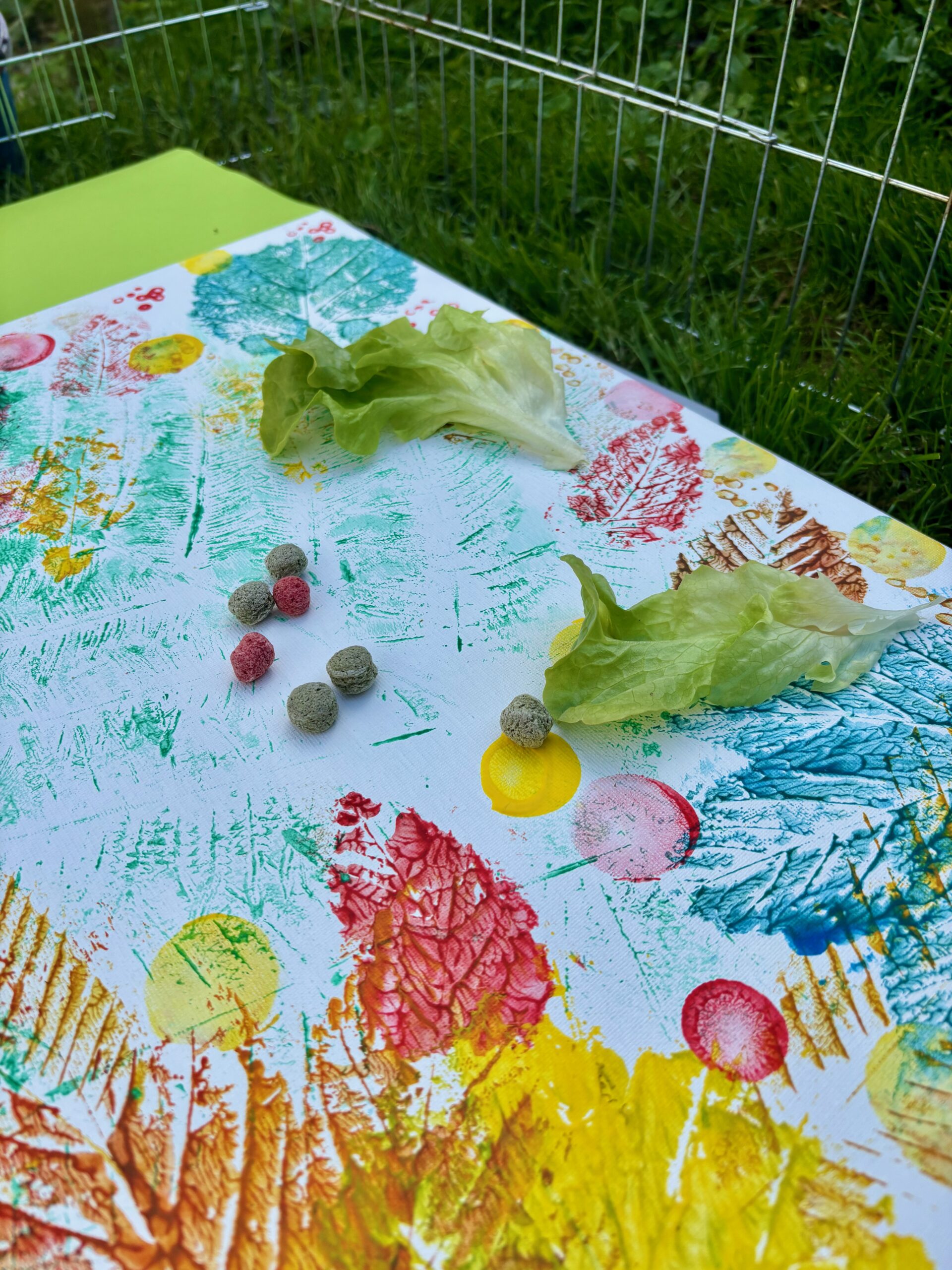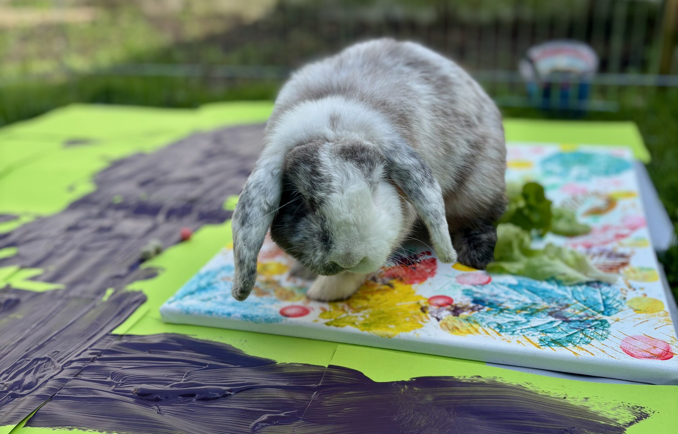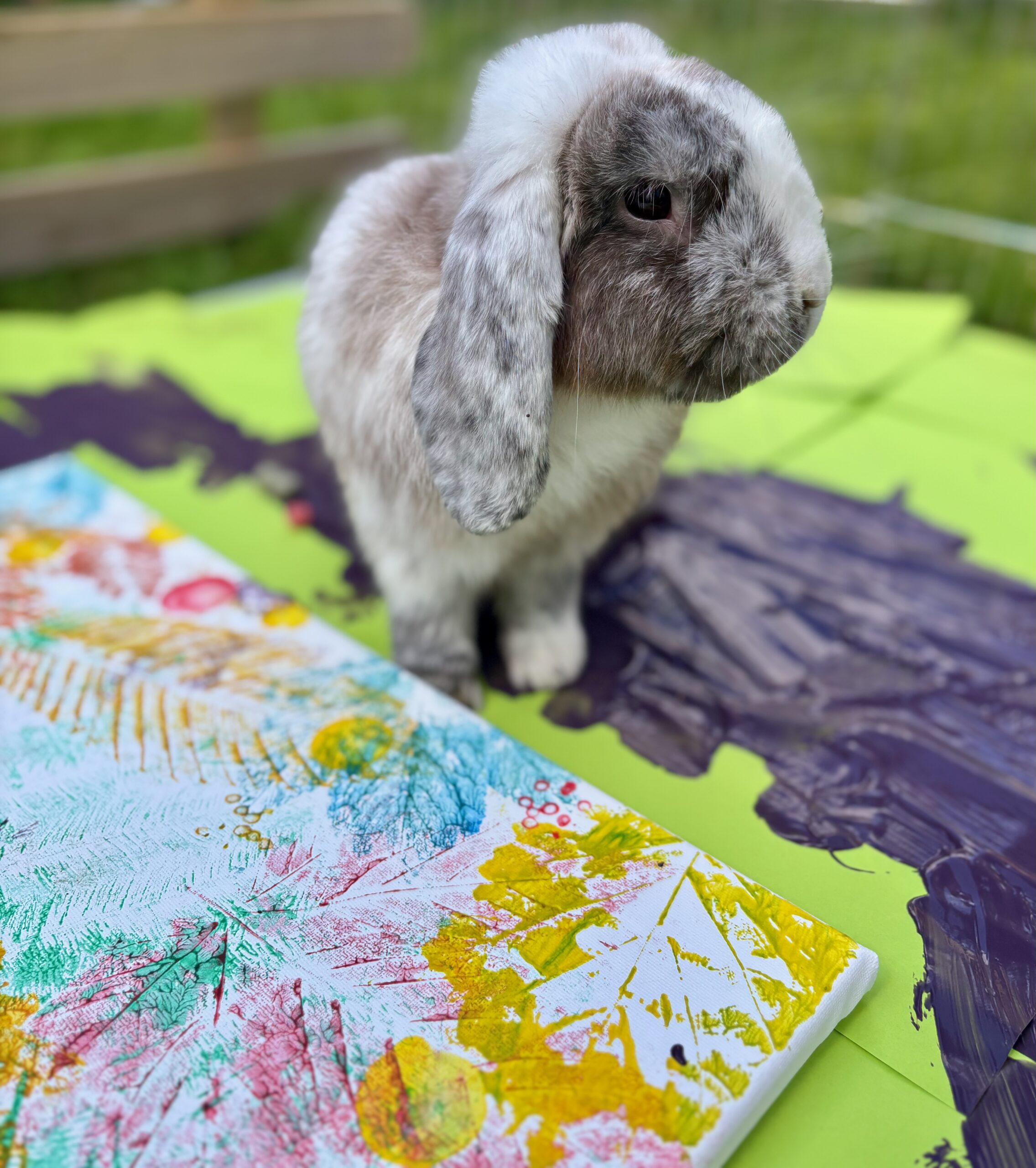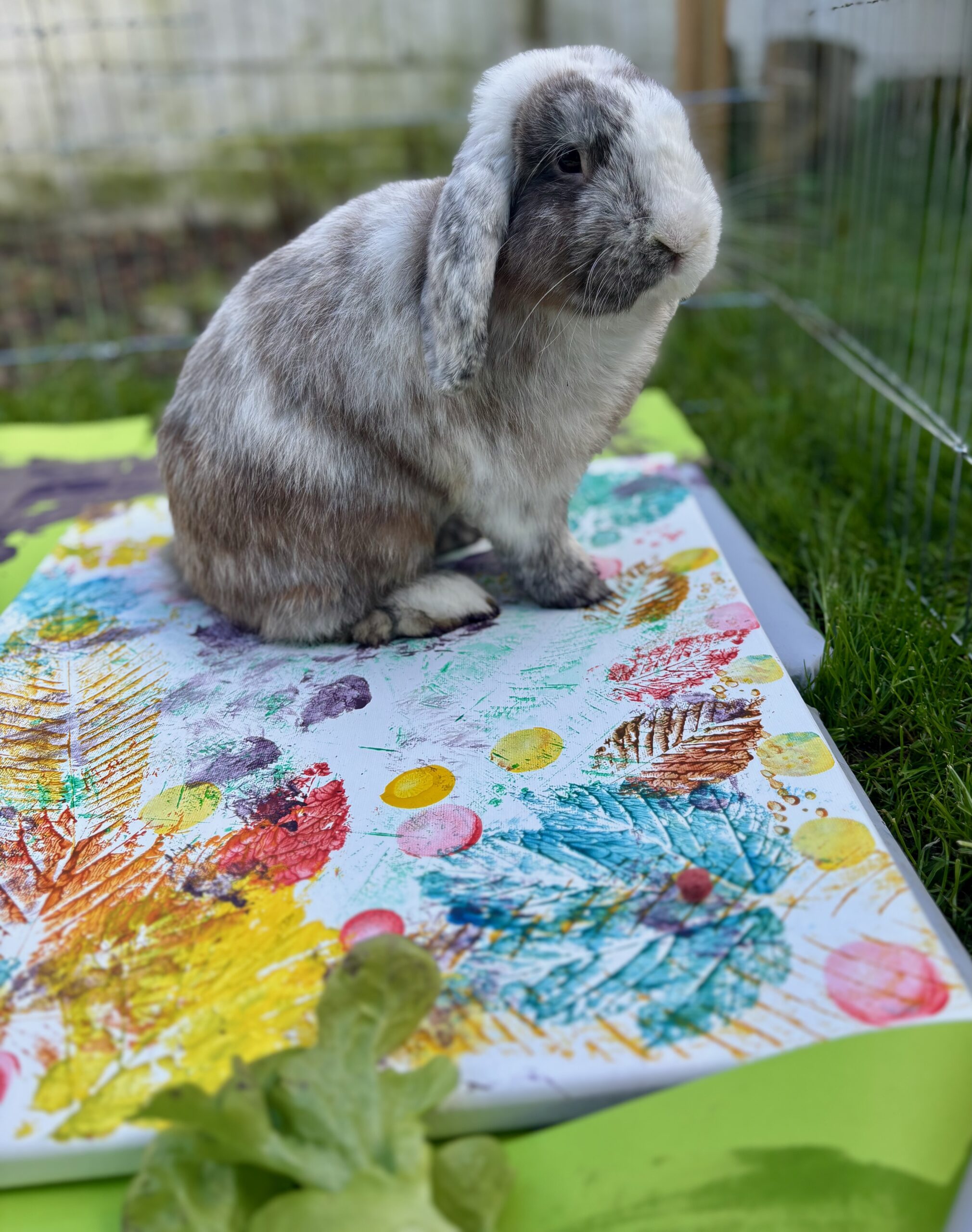 Enfin, lors de la dernière séance, nous avons réuni tous ces éléments pour une expérience artistique unique. Les bénéficiaires ont pu utiliser les feuilles ramassées précédemment pour peindre et créer une toile collective. Pissenlit, notre lapin Minilop, a ensuite apporté sa touche personnelle en marchant délicatement sur la toile, laissant des empreintes de ses petites pattes. Cet atelier a permis de clôturer en beauté la série de médiation animale en alliant l’art, la nature et l’interaction avec nos lapins.