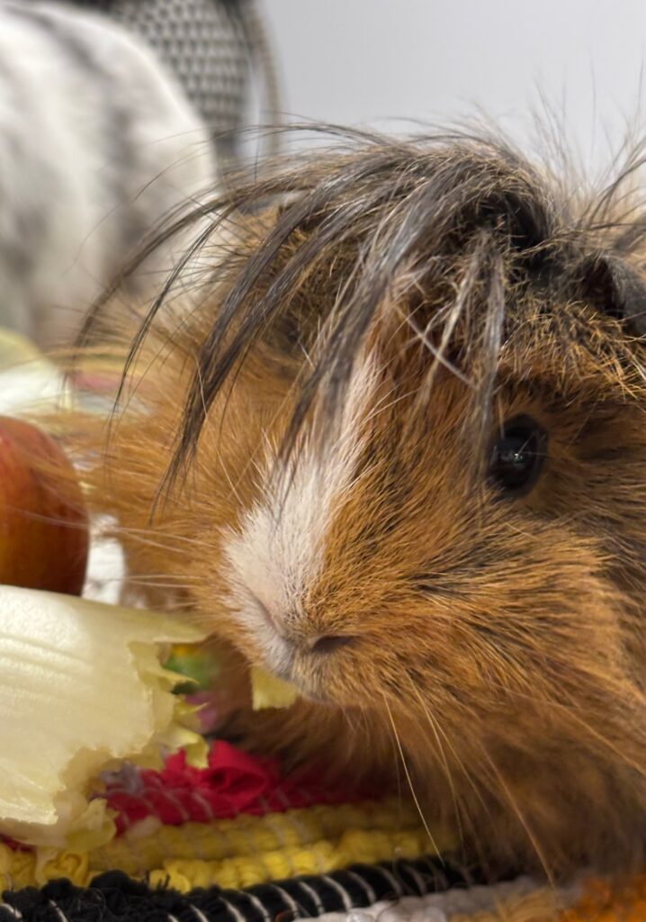 Ces deux cochons d’Inde de médiation font fondre les cœurs ! Leurs petits bruits, leur douceur et leur curiosité sont une source de réconfort et de plaisir pour les bénéficiaires. Ils adorent se faire nourrir car ils sont gourmands.
